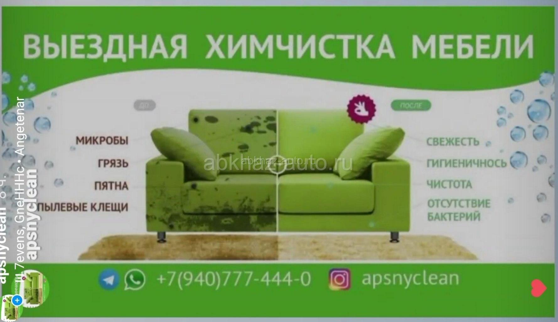 Дополнительная информация: Наша фирма(Apsnyclen) 6 лет уже мы чистим мебель по всей Абхазии.Наша химия безопасна для детей и животных. диваны, стулья, кресла, матрасы, и прочая текстильная и кожанная мебель, ковры и ковролины. Обращайтесь по номеру +7(940) 7774440 вотсап, телеграм, инстаграм и Фейсбук. Мы Работаем На Качество!!!