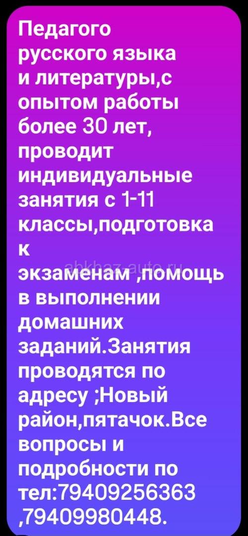 Дополнительная информация: Педагого русского языка и литературы, с опытом работы более 30 лет, проводит индивидуальные занятия с 1-11 классы, подготовка K экзаменам,помощь в выполнении домашних заданий. Занятия проводятся по адресу ;Новый район, пятачок. Все вопросы и подробности по тел:79409256363 ,79409980448.