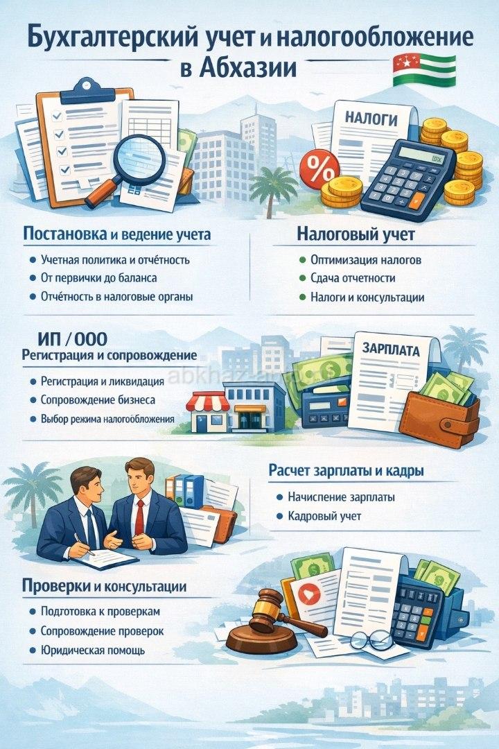 Дополнительная информация: ✅ Постановка и ведение бухгалтерского учёта • Разработка учетной политики и регистрация в налоговой • Полное ведение учёта: от первички до баланса • Подготовка и сдача обязательной отчётности в налоговые органы Абхазии ✅ Налоговый учет и отчётность • Расчет и оптимизация налогов в рамках действующего законодательства • Сдача налоговой и статистической отчетности • Консультации по режимам налогообложения ✅ Работа с ИП и ООО • Регистрация, ликвидация, смена учредителей • Сопровождение бизнеса на всех этапах • Упрощёнка, патент или общий режим — поможем выбрать оптимальный ✅ Расчёт заработной платы и кадровый учет • Начисление зарплаты, больничных, отпусков, пособий • Ведение кадровой документации, трудовые договоры ✅ Консультации и сопровождение проверок • Подготовка к налоговой проверке • Сопровождение при запросах из контролирующих органов • Внесудебное урегулирование спорных ситуаций