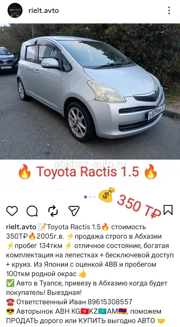 Двигатель: бензиновый, 1.5 л Трансмиссия: автоматическая Кузов: хэтчбэк Цвет: серебристый металлик Пробег: 134 км Год выпуска: 2005 Регион: Вся Абхазия Дополнительная информация: 📝Toyota Ractis 1.5🔥 стоимость 350Т₽🔥2005г.в. ⚡продажа строго в Абхазии ⚡пробег 134ткм ⚡ отличное состояние, богатая комплектация на лепестках + бесключевой доступ + круиз. Из Японии с оценкой 4ВВ и пробегом 100ткм родной окрас 👍 ✅ Авто в Туапсе, привезу в Абхазию когда будет покупатель! Выездная! ☎ Ответственный Иван 89615308557