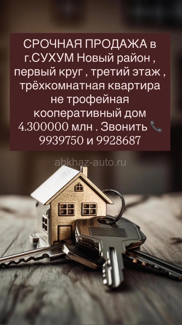 Дополнительная информация: СРОЧНАЯ ПРОДАЖА в г. СУХУМ Новый район, первый круг, третий этаж, трёхкомнатная квартира не трофейная кооперативный дом 4.300000 млн. Звонить 9939750 и 9928687
