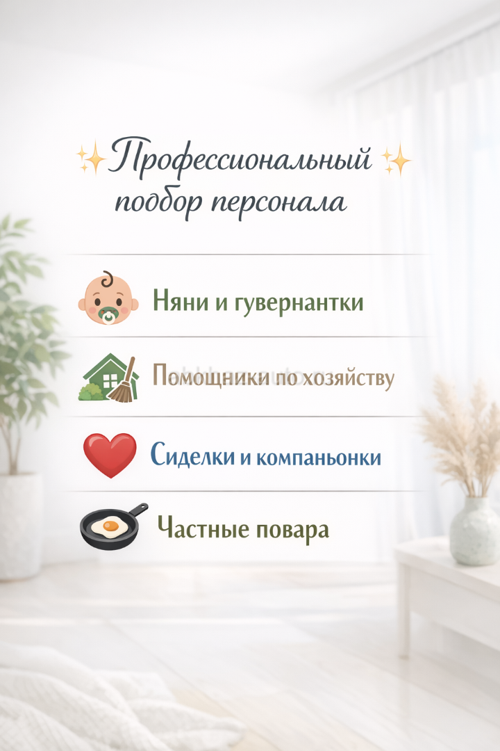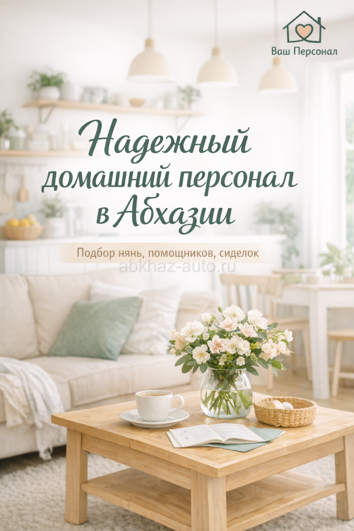 Дополнительная информация: Наша услуга «Подбор домашнего персонала в Абхазии» — это ваш ключ к спокойствию и порядку. Мы тщательно подбираем проверенных, ответственных и добросовестных специалистов, которые станут частью вашего комфорта. Для кого наши услуги: * Семьям с детьми — опытные няни и гувернантки. * Занятым профессионалам — помощники по хозяйству и домработницы. * Для заботы о старшем поколении — внимательные сиделки и компаньонки. * Для создания уюта — частные повара и садовники. Почему выбирают нас? ✔ Личное собеседование и проверка рекомендаций. ✔ Учёт всех ваших пожеланий и особенностей семьи. ✔ Подбор кандидатов, знакомых с местной спецификой Абхазии. ✔ Помощь в согласовании условий и оформлении. Верните себе самое ценное — время для себя, работы и отдыха с семьёй.