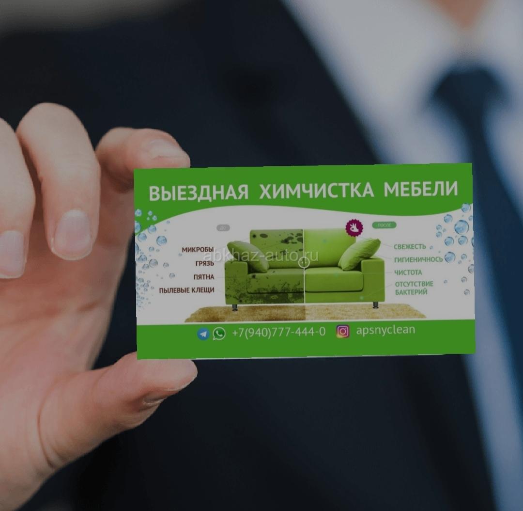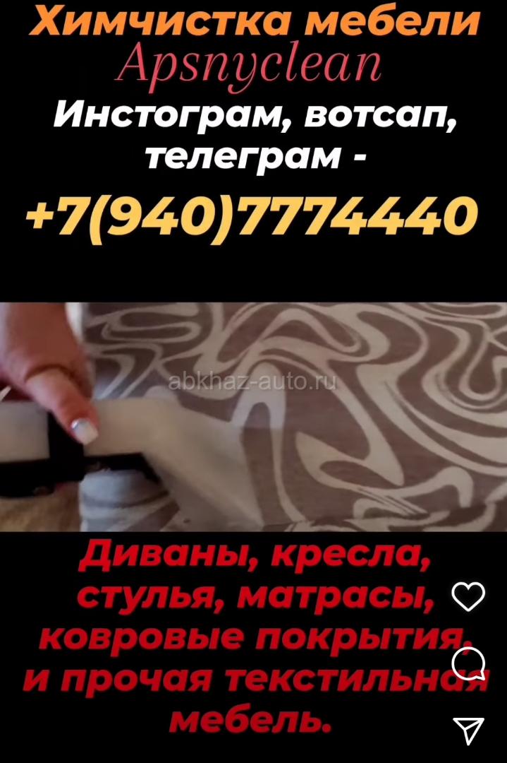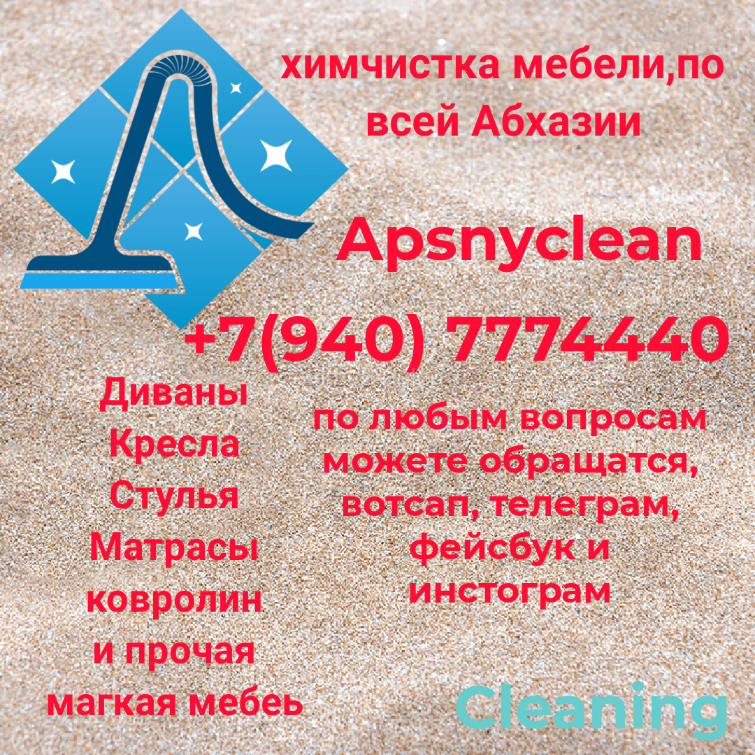 Дополнительная информация: Наша фирма(Apsnyclen) 6 лет уже мы чистим мебель по всей Абхазии.Наша химия безопасна для детей и животных. диваны, стулья, кресла, матрасы, и прочая текстильная и кожанная мебель, ковры и ковролины. Обращайтесь по номеру +7(940) 7774440 вотсап, телеграм, инстаграм и Фейсбук. Мы Работаем На Качество!!!