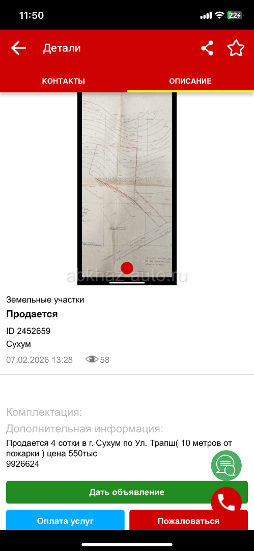 Дополнительная информация: Продается 4 сотки в г. Сухум по Ул. Трапш( 10 метров от пожарки ) цена 550тыс 9926624