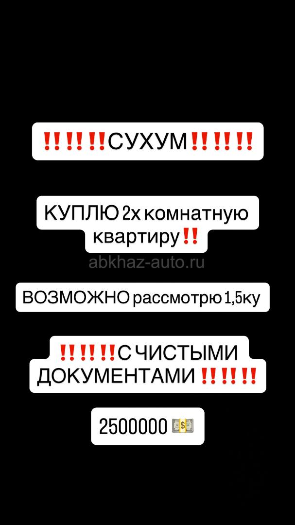 Дополнительная информация: Куплю квартиру в ГОРОДЕ СУХУМ!!!ТОЛЬКО КВАРТИРУ, ничего больше не предлагать, читайте внимательно!!! Двухкомнатную или полуторку ! С полным пакетом документов!!! Фото и видео присылайте сразу по номеру в ватсап или телеграмм. Впн поможет. Старый поселок нет , массив нет! +79969650069 Я местная, фигню не предлагать !!!!!!