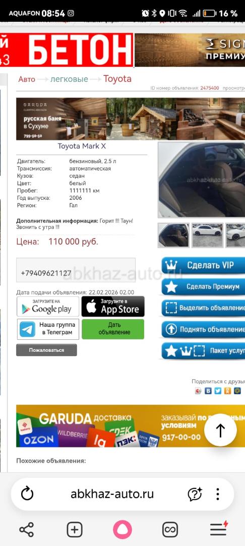 Двигатель: бензиновый, 2.5 л Трансмиссия: автоматическая Кузов: седан Цвет: белый Пробег: 111111 км Год выпуска: 2006 Регион: Сухум Дополнительная информация: Тот кто это выставил набери мне не номер 9207001 я хочу тебя увидеть. Если ты такои смелый и щитаеш себя мужиком. Ко всем другим милион извинений.