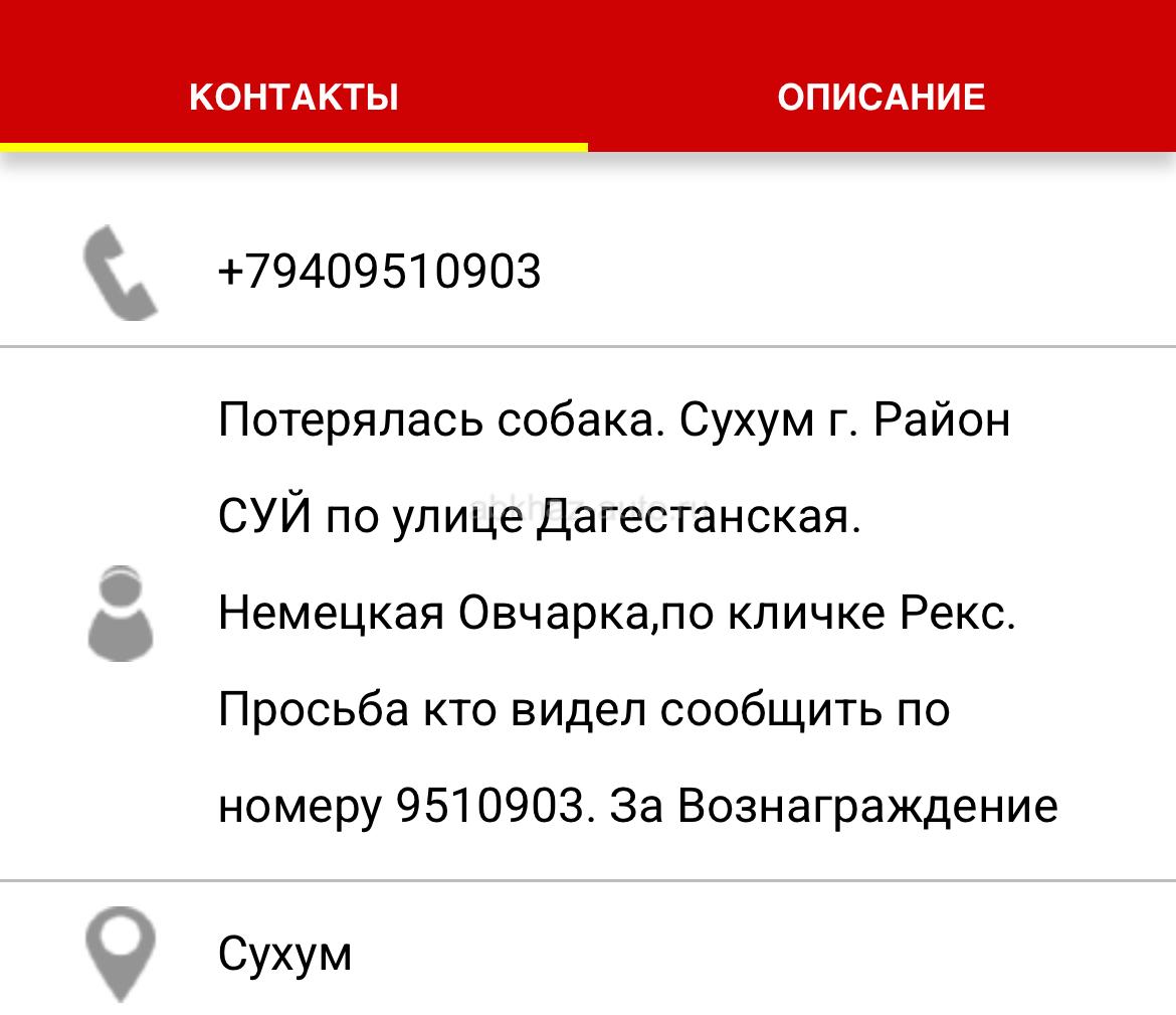Имя: Потерялась собака. Сухум г. Район СУЙ по улице Дагестанская. Немецкая Овчарка,по кличке Рекс. Просьба кто видел сообщить по номеру 9510903. За Вознаграждение