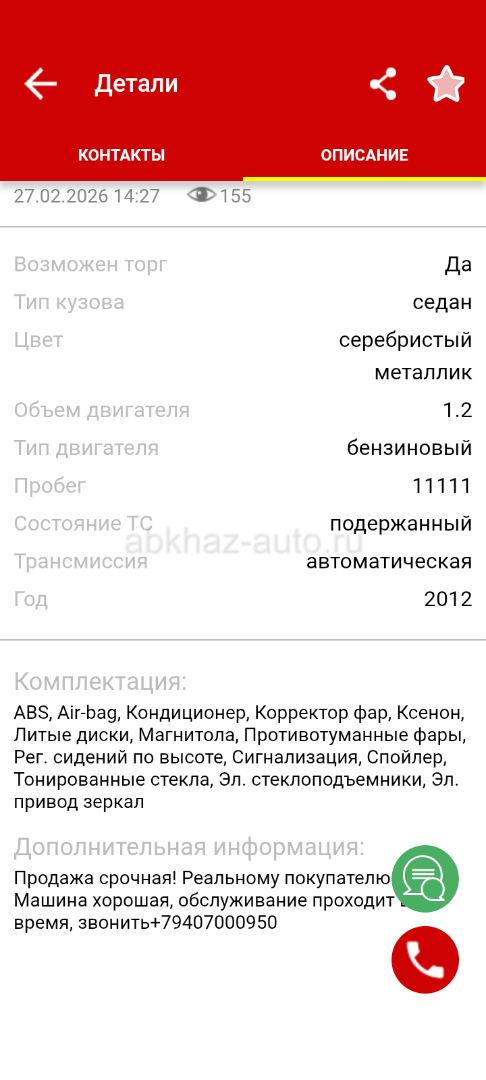Двигатель: бензиновый, 1.2 л Трансмиссия: автоматическая Кузов: седан Цвет: серебристый металлик Пробег: 11111 км Год выпуска: 2012 Регион: Сухум Комплектация: Air-bag, ABS, Кондиционер, Корректор фар, Ксенон, Литые диски, Магнитола, Противотуманные фары, Рег. рулевая колонка, Рег. сидений по высоте, Сигнализация, Спойлер, Тонированные стекла, Спортивная подвеска, Эл. привод зеркал, Эл. стеклоподъемники.