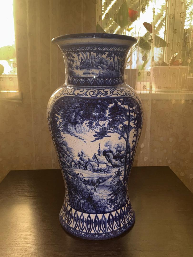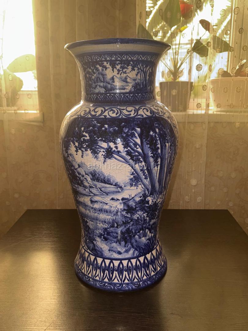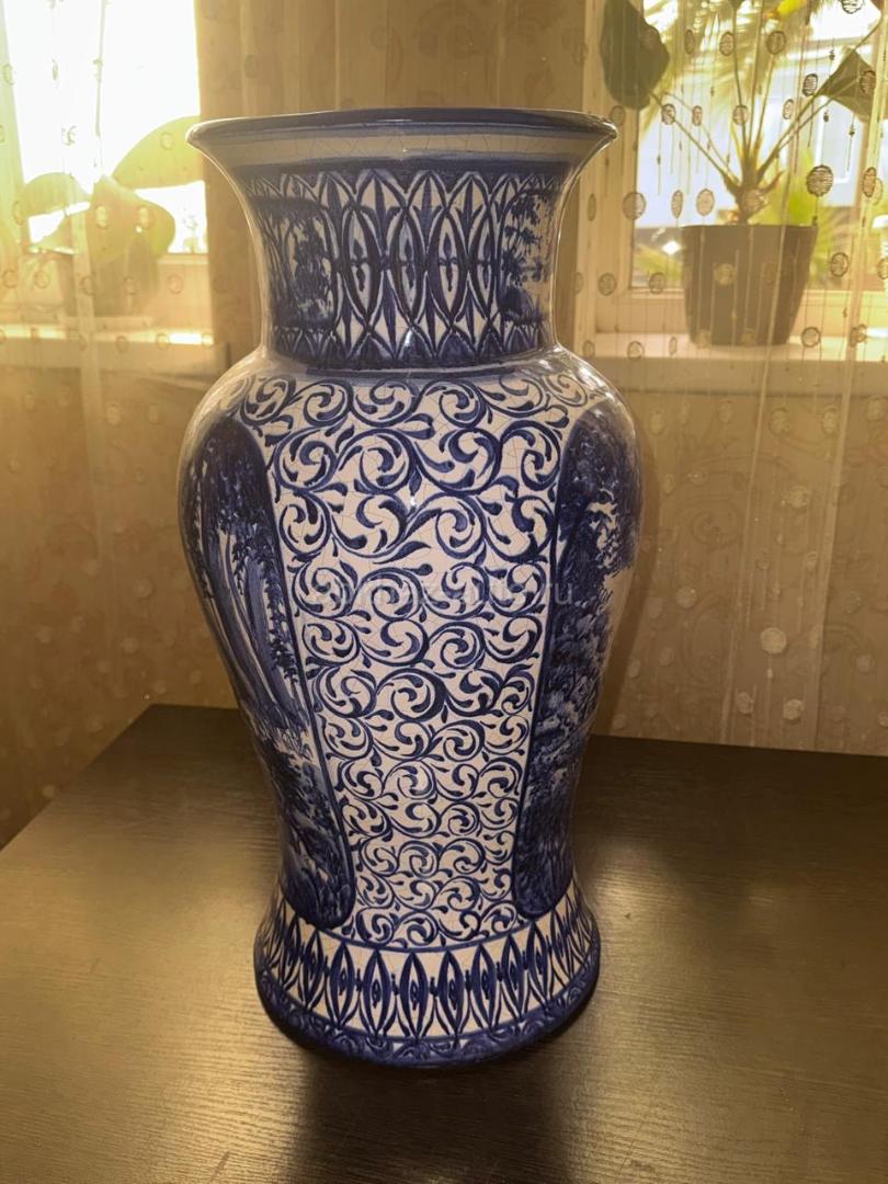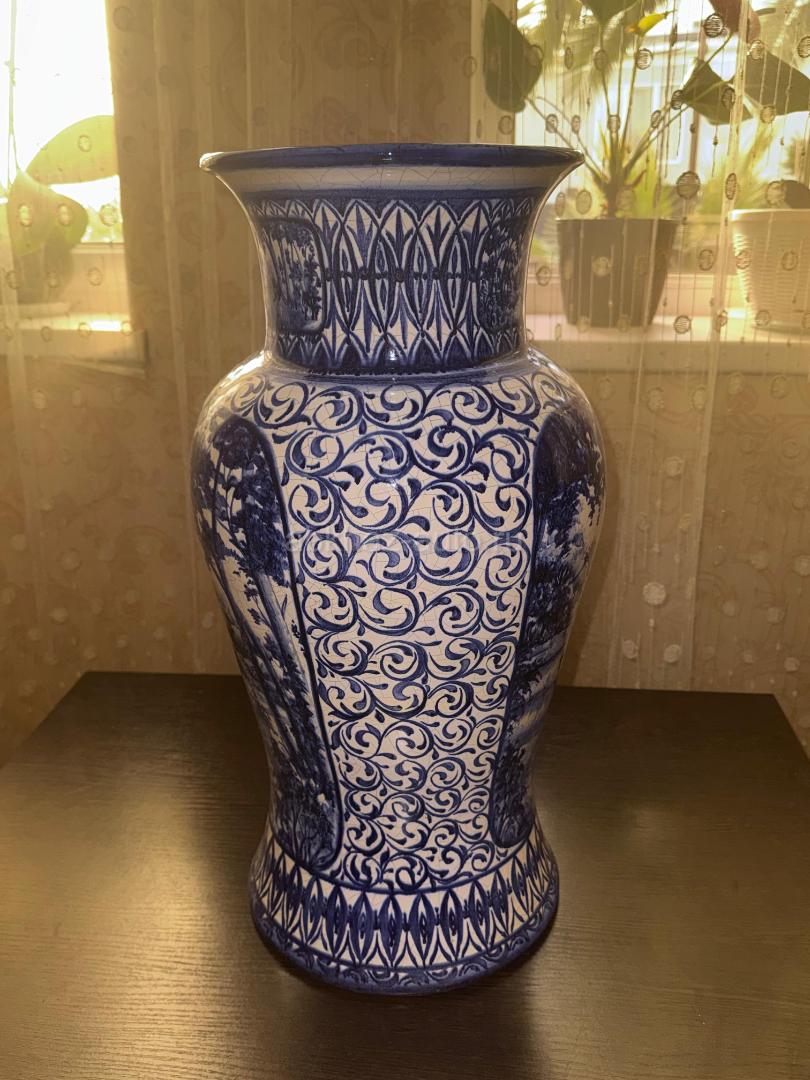 Дополнительная информация: Продается редкая антикварная напольная ваза Гжель довоенного периода (1930-е годы). Высота изделия составляет 1 метр — это монументальный и статусный экземпляр, который редко встречается в таком размере. Ваза выполнена из фарфора с детальной ручной росписью кобальтом (сложный лесной пейзаж). Оригинал, имеет характерную возрастную сетку кракелюра, подтверждающую подлинность и почтенный возраст изделия. Состояние хорошее коллекционное, без крупных дефектов. Идеальный выбор для ценителей русского фарфора или украшения изысканного интерьера. Цена: 40 000 ₽