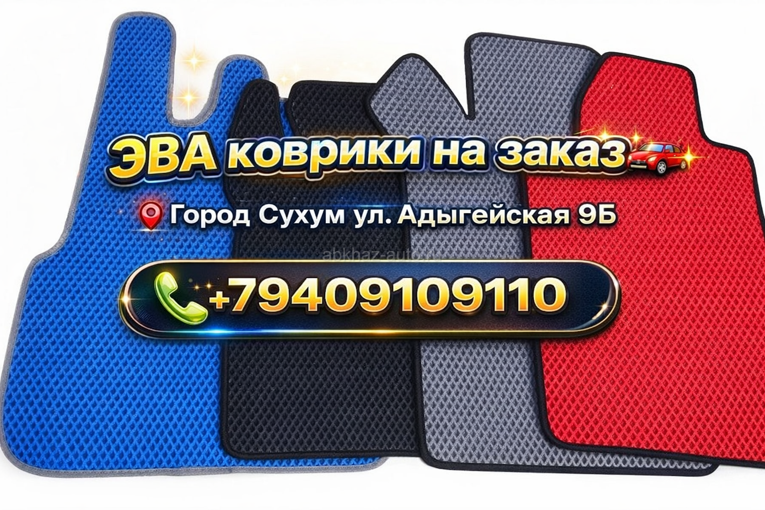 Дополнительная информация: Ваш салон заслуживает лучшего. Мы изготавливаем EVA-ковры ИДЕАЛЬНО под вашу модель авто — без зазоров, складок и компромиссов. 💎 Почему выбирают EVAlution? ✅ 100% защита от грязи, воды и песка ✅ Стильный внешний вид — подчёркивает интерьер авто ✅ Любой цвет и размер под ваш вкус ✅ Лёгкая чистка — встряхнул и поехал ✅ Прочный EVA-материал — служит годами ⚡ Быстро? Очень! Изготовление от 25 минут — вы не ждёте, вы наслаждаетесь результатом. 📍 Мы находимся: г. Сухум, ул. Адыгейская, 39 (здание «Дорош») 🕘 Работаем: Пн – Сб | 9:00 – 21:00 📞 Заказ и консультация: +7 940 910-91-10 💬 WhatsApp — отвечаем быстро 📸 Наши работы в Instagram: https://www.instagram.com/abh_evalution� 👉 EVAlution — эволюция комфорта в вашем автомобиле. Попробуйте один раз — и к обычным коврам вы не вернётесь 😎🚘