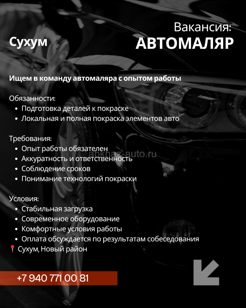 Дополнительная информация: Ищем в команду автомаляра с опытом работы Обязанности: Подготовка деталей к покраске Локальная и полная покраска элементов авто Требования: Опыт работы обязателен Аккуратность и ответственность Соблюдение сроков Понимание технологий покраски Условия: Стабильная загрузка Современное оборудование Комфортные условия работы Оплата обсуждается по результатам собеседования 📍 Сухум, Новый район +7 940 771 00 81
