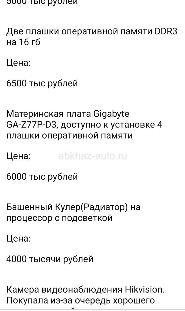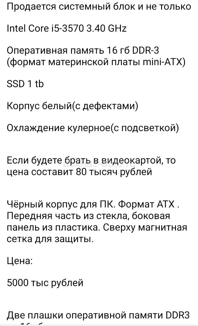 Дополнительная информация: Продается системный блок и не только Intel Core i5-3570 3.40 GHz Оперативная память 16 гб DDR-3 (формат материнской платы mini-ATX) SSD 1 tb Корпус белый(с дефектами) Охлаждение кулерное(с подсветкой) Если будете брать в видеокартой, то цена составит 80 тысяч рублей Чёрный корпус для ПК. Формат АТХ . Передняя часть из стекла, боковая панель из пластика. Сверху магнитная сетка для защиты. Цена: 5000 тыс рублей Две плашки оперативной памяти DDR3 на 16 гб Цена: 6500 тыс рублей Материнская плата Gigabyte GA-Z77P-D3, доступно к установке 4 плашки оперативной памяти Цена: 6000 тыс рублей Башенный Кулер(Радиатор) на процессор с подсветкой Цена: 4000 тысячи рублей Камера видеонаблюдения Hikvision. Покупала из-за очередь хорошего качества на сайте производителя данная модель 14 тыс(данная фирма используется в вокзалах и аэропортах РФ), продаю из-за ненадобности Цена: 7 тысяч рублей Принимаю только СМС на what's up. Без звонков. Номер: +79409932655 Илона