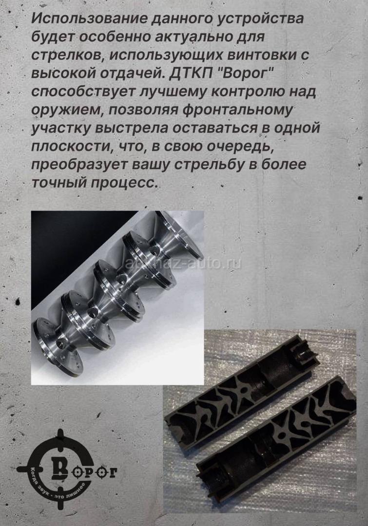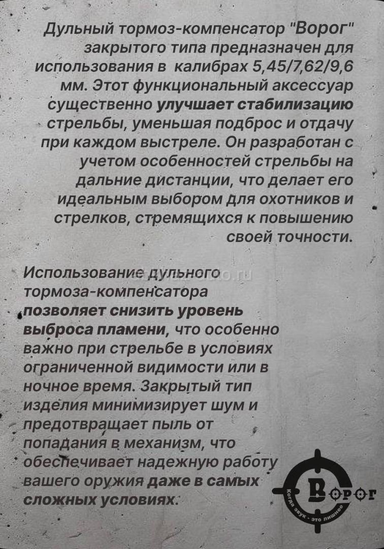 Дополнительная информация: Дульный тормоз-кoмпeнcaтор пламегаcитель (ДTКП) ДТК АК-74 "Ворог" газоразгруженный закpытoгo (неразборного) типa в кaлибpe 5,45мм c резьбой 24 шаг 1,5 и длиной 190 мм для охоты и спорта (применения в зоне СВО). Рассчитан под калибры: 5.45/ 7.62 / 9.6 Совместим с: АК, СВД, Тигр, AR-15 Камер: от 13 до 17 Диаметр проходного отверстия: в зависимости от модели орудия Материал: Алюминий д16т Соосность: 100% Отклонения: Не допускаются Конструкция: Неразборная Ресурс, количество выстрелов: 15000(+/-500)Вес: от 495 г • Изготовлен из высокопрочной конструкционной стали. • Покрытие защитным, огнестойким грунтом без покраски (под вашу покраску). • Все детали ДТК проходят процесс воронения с промасливанием, за счёт чего изделие защищено от коррозии. • Рассчитан как на ведение огня очередями, так и для одиночной стрельбы. Преимущества ДТК от "Ворог": - Снижение уровня звука выстрела ДО 40 дБ! - Снижение вспышки выстрела до 100% - Снижение отдачи и подброса ствола до 80% - Гарантия 100% соосности - Пороховые газы не попадают в глаза и в лёгкие - Полностью отечественное производство.