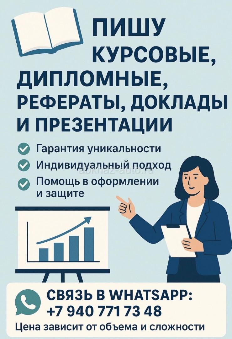 Дополнительная информация: 📚 Пишу курсовые, дипломные, рефераты, доклады и презентации Работы любой сложности — быстро, грамотно и с учетом требований ВУЗа. ✅ Гарантия уникальности ✅ Индивидуальный подход ✅ Помощь в оформлении и защите 💬 Связь в WhatsApp: +7 940 771 73 48 Цена зависит от объема и сложности.