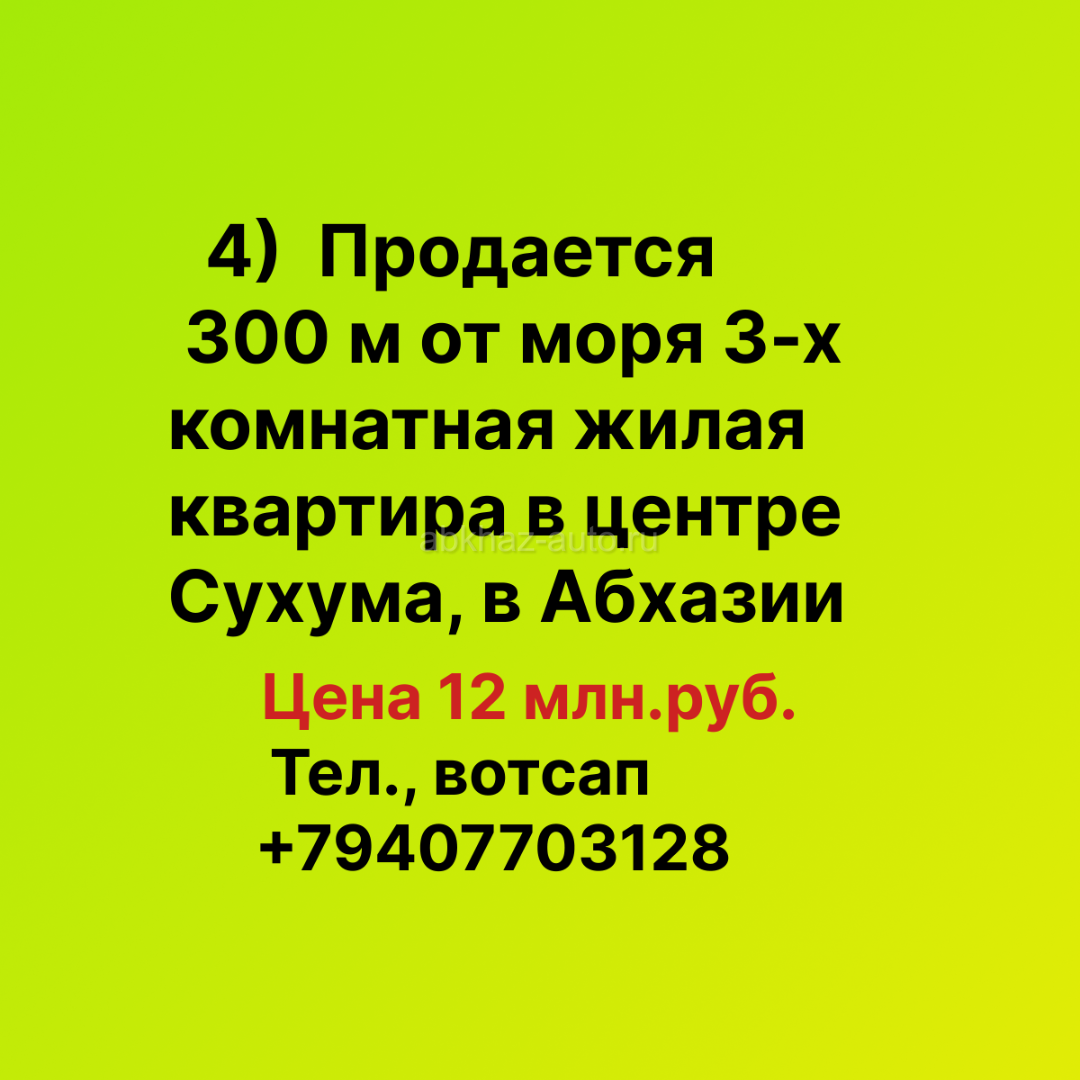 Дополнительная информация: 4) Продается 300 м от моря 3-х комнатная жилая квартира в центре Сухума, в Абхазии. В квартире есть лоджия. Квартира со средним ремонтом, расположена на 3-ем этаже. Цена 12 млн.руб. Тел., вотсап +79407703128