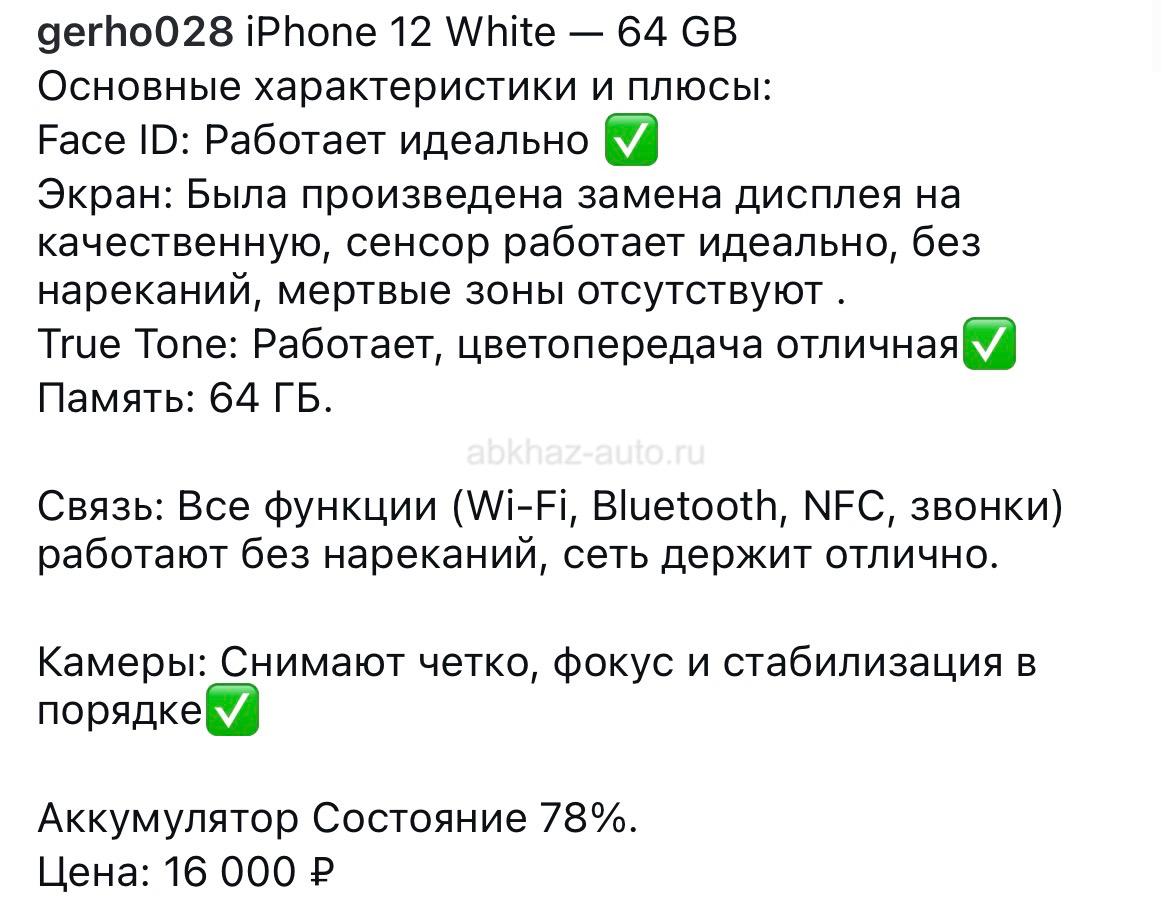 Дополнительная информация: iPhone 12 64gb 78% аккумулятор Фейс тру тон все работает идеально! Была замена экрана . Работает нормально 79407195579 вотсап Обмен только с вашей доплатой , равноценную не предлагать !