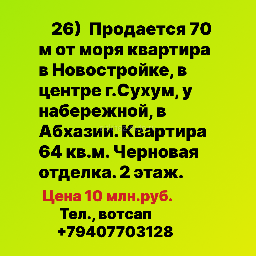 Дополнительная информация: 26) Продается 70 м от моря квартира в Новостройке, в центре г.Сухум, у набережной, в Абхазии. Квартира 64 кв.м. Черновая отделка. 2 этаж. Цена 10 млн.руб Тел., Вотсап +79407703128