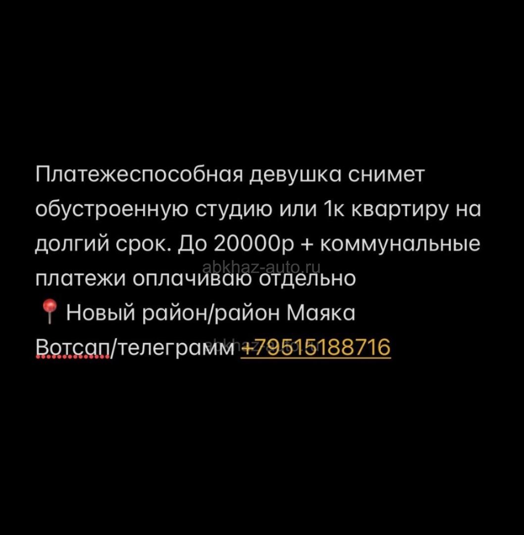 Дополнительная информация: Платежеспособная девушка снимет обустроенную студию или 1к квартиру на долгий срок. До 20000р + коммунальные платежи оплачиваю отдельно 📍Новый район/район Маяка Вотсап/телеграмм +79515188716
