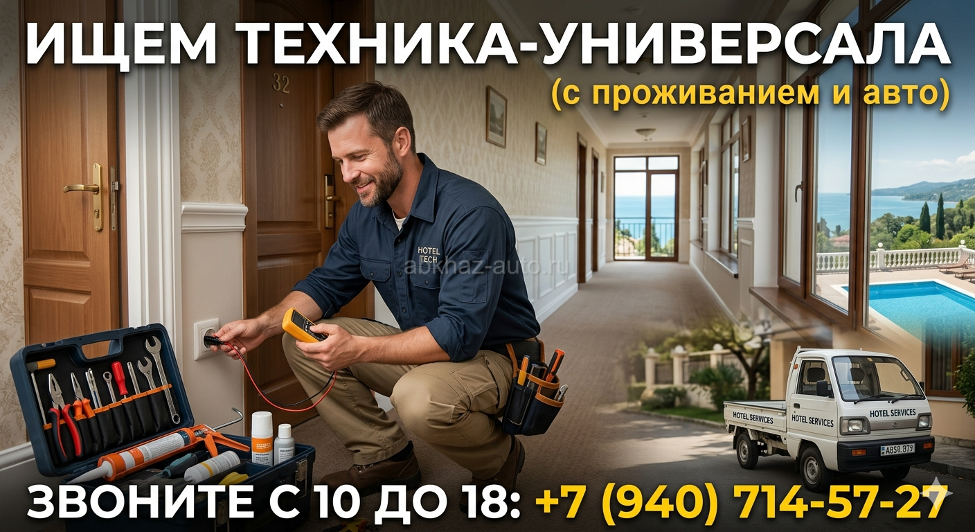 Дополнительная информация: Техник-универсал в отель (57 номеров) В отель (Цандрипш/ Абхазия) требуется «мастер на все руки» для круглогодичной работы с проживанием. Обязанности: • Номерной фонд: оперативный ремонт электрики (розетки, свет), сантехники (смесители, устранение течей, замена герметика) и мебели. • Мелкий ремонт: устранение подтеков на потолках, подкраска, подклейка обоев. • Бассейн: чистка, контроль химии и работы оборудования. Требования: • Опыт в эксплуатации зданий или ЖКХ. • Наличие личного авто (обязательно). • Умение работать руками и самостоятельно решать технические задачи. • Готовность к ненормированному графику (дежурство на объекте). Условия: • Проживание и питание на территории отеля (бесплатно). • Работа круглый год, достойная и стабильная зарплата. Контакты: 📞 +7 (940) 714-57-27 (Виктория) Звонки строго с 10:00 до 18:00. Писать: WhatsApp / Telegram