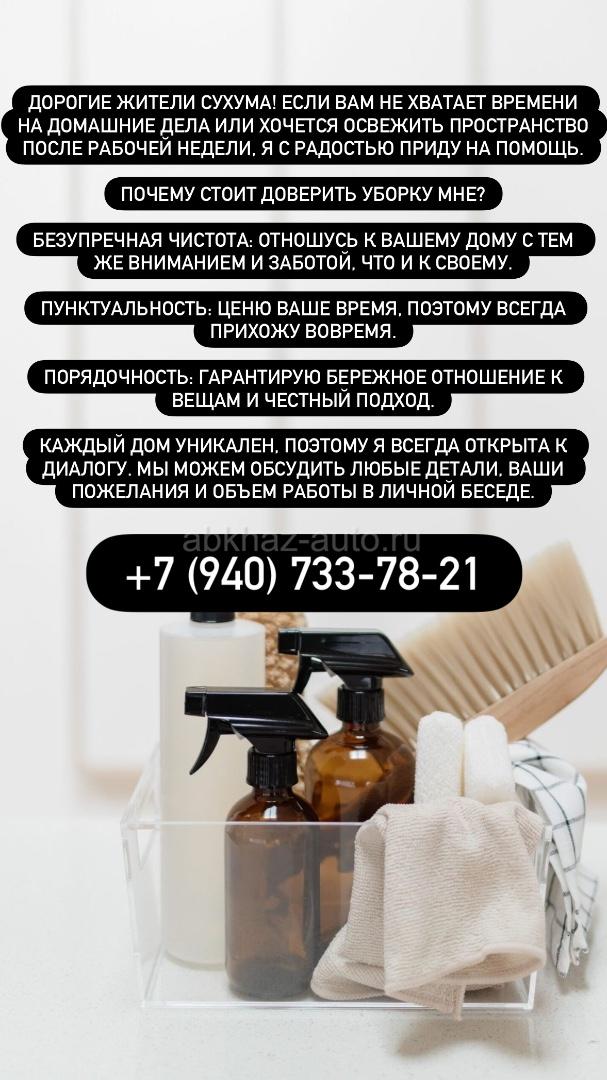 Дополнительная информация: Дорогие жители Сухума! Если вам не хватает времени на домашние дела или хочется освежить пространство после рабочей недели, я с радостью приду на помощь. Почему стоит доверить уборку мне? Безупречная чистота: Отношусь к вашему дому с тем же вниманием и заботой, что и к своему. Пунктуальность: Ценю ваше время, поэтому всегда прихожу вовремя. Порядочность: Гарантирую бережное отношение к вещам и честный подход. Каждый дом уникален, поэтому я всегда открыта к диалогу. Мы можем обсудить любые детали, ваши пожелания и объем работы в личной беседе.