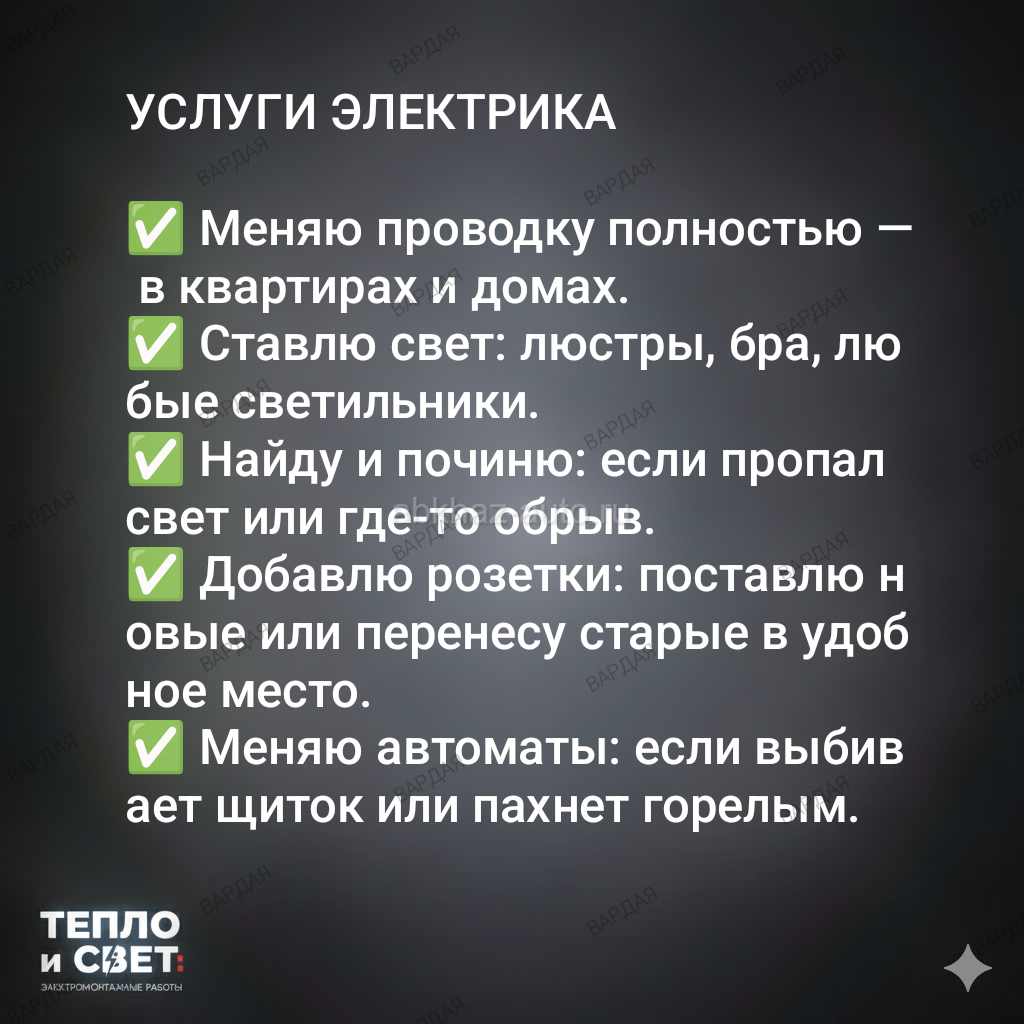 Дополнительная информация: Электромонтажные работы. В том числе ремонт электрообогревателей, водонагревателей и бытовой техники.