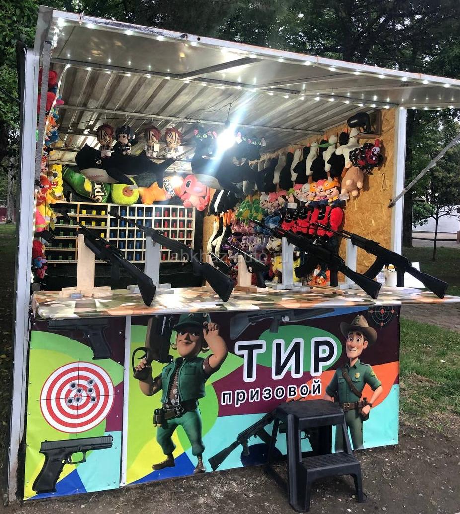 Дополнительная информация: Продается готовый бизнес на летний сезон. Призовой тир в комплекте со всем необходимым оснащением. Сам каркас полностью собран из проф трубы и профнастила, внутри обшит ОСБ, снаружи баннеры на всю стену со всех сторон тира. В комплекте 2 автомата АК-74, один из них с коллиматорным прицелом, 2 винтовки (пятизарядная и однозарядная), подставки под оружия, подставка для детей, аккумуляторные батареи и игрушки. Размер тира 2.20 на 4.5 м Переносной. Продается без места.