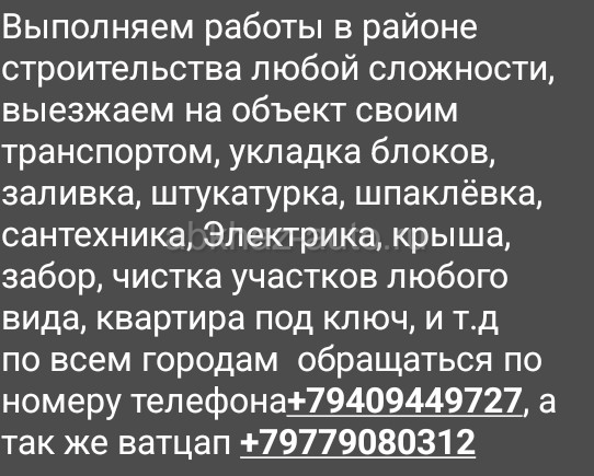 Дополнительная информация: Выполняем работы в районе строительства любой сложности, выезжаем на объект своим транспортом, укладка блоков, заливка, штукатурка, шпаклёвка, сантехника, Электрика, крыша, забор, чистка участков любого вида, квартира под ключ, и т.д Гагра, Пицунда, Гудаута, Афон, обращаться по номеру телефона+79409449727, а так же ватцап +79779080312