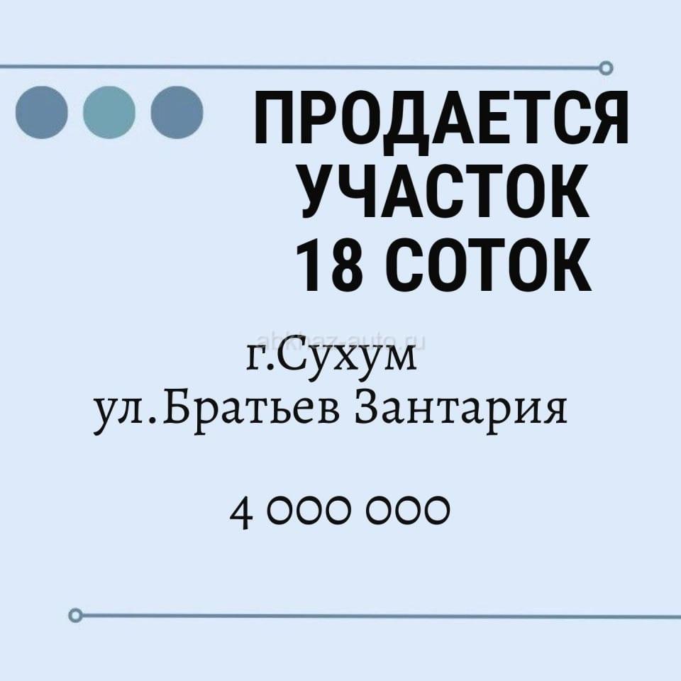 Дополнительная информация: 🌳 В продаже участок 18 соток по ул. Братьев Зантария 🌳 Прекрасный просторный участок для вашего будущего дома или загородного проекта! ✅ Площадь: 18 соток – достаточно места для дома, сада, гаража и зоны отдыха ✅ Документы полностью оформлены – покупка без лишних хлопот ✅ Цена: 4 000 000 ₽ 📞 Контакты: +7 940 919-32-36 +7 940 994-70-91 💡 Идеальный вариант для тех, кто ищет пространство и свободу для реализации своих идей!