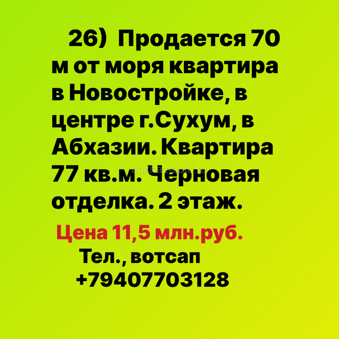 Дополнительная информация: 27) Продается 70 м от моря квартира в Новостройке, в центре г.Сухум, у набережной, в Абхазии. Квартира 77 кв.м. Черновая отделка. 2 этаж. Цена 11,5 млн.руб Тел., Вотсап +79407703128