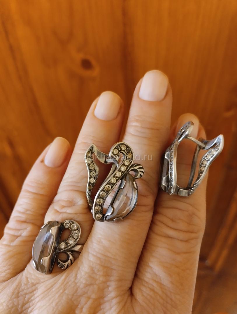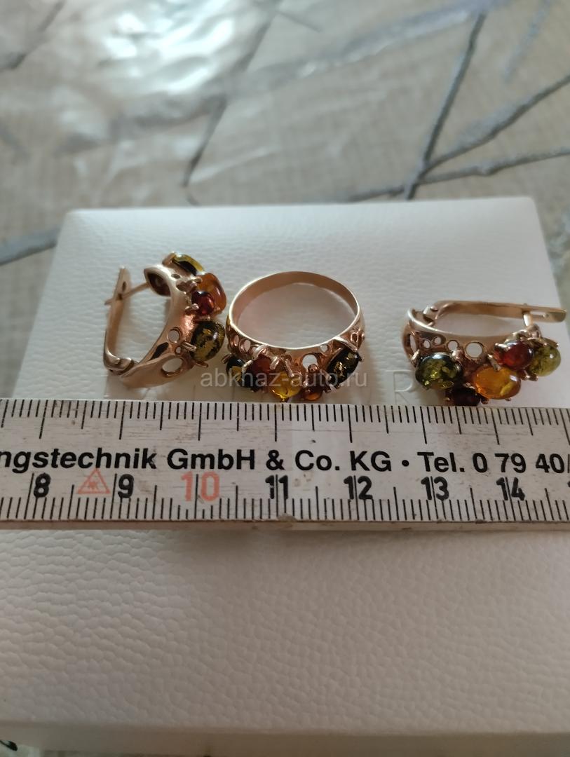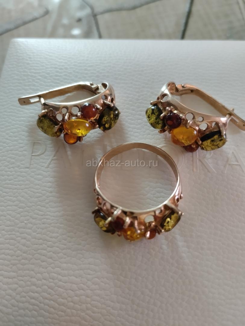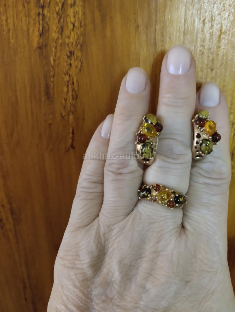 Серьги и кольцо из серебра. Комплект из серебра с позолотой и янтарем.