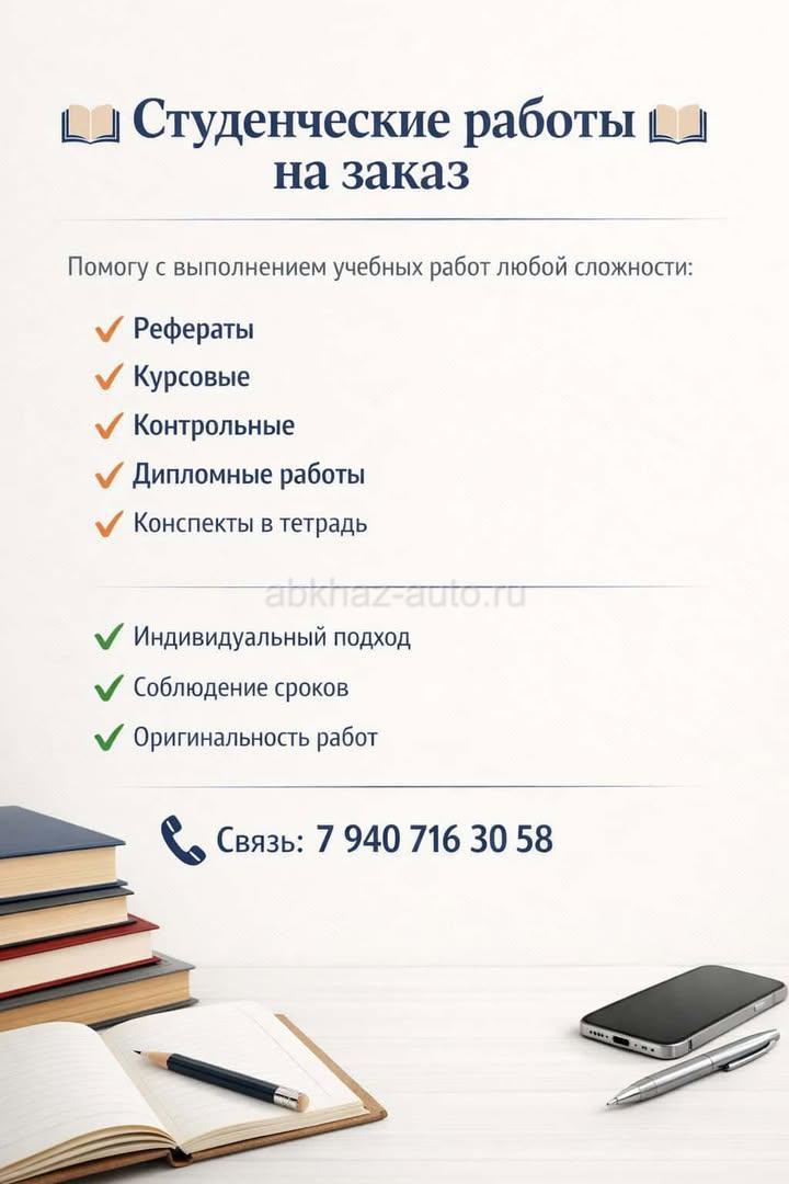Дополнительная информация: Пишу студенческие работы: Курсовые, дипломные, рефераты, конспекты. Все вопросы по телефону на ватсап 79407163058