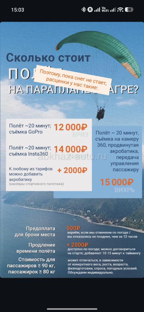 Дополнительная информация: Вы мечтаете о полётах? Вы летаете во снах?))) Вы завидуете птицам? Полет на параплане, конечно, не даст вам ощущения полной свободы полёта, но всё же пусть отдалённо но приблизит вас к мечте, к сказке. Не бойтесь! Вы не будете одни в воздухе, с вами будет квалифицированный пилот, это полет в тандеме. Полет осуществляется с горы Мамзышка, высота полёта 1500м, продолжительность полёта 15-20 мин. По договорённости, заранее бронируйте время, и день. Не каждый день лётный, по погодным условиям. Поэтому планируйте ваш отдых заранее. Запись можно сделать по телефону,, на вацап. Стоимость полёта 12т.р., фото/видео фиксация входит в стоимость. Предоплата 500р/чел Полет с панорамной фото/видео съёмкой стоит 14000р/чел