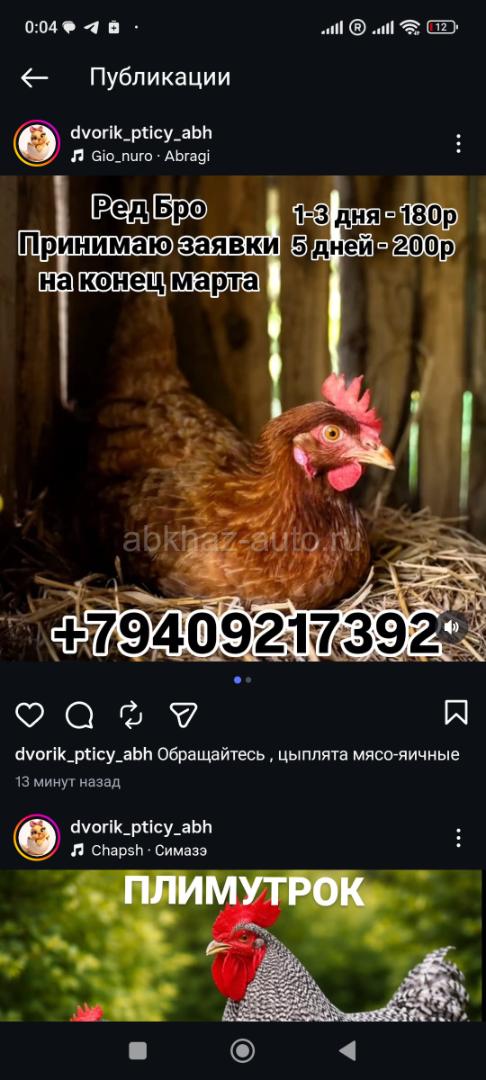 Дополнительная информация: Продаются цыплята десятидневные по 220 руб В количестве 100 штук кто все вместе берёт по 200 руб. город Сухум телефон 921-73-92 мясо-яичные Ред бро,мастер Грей