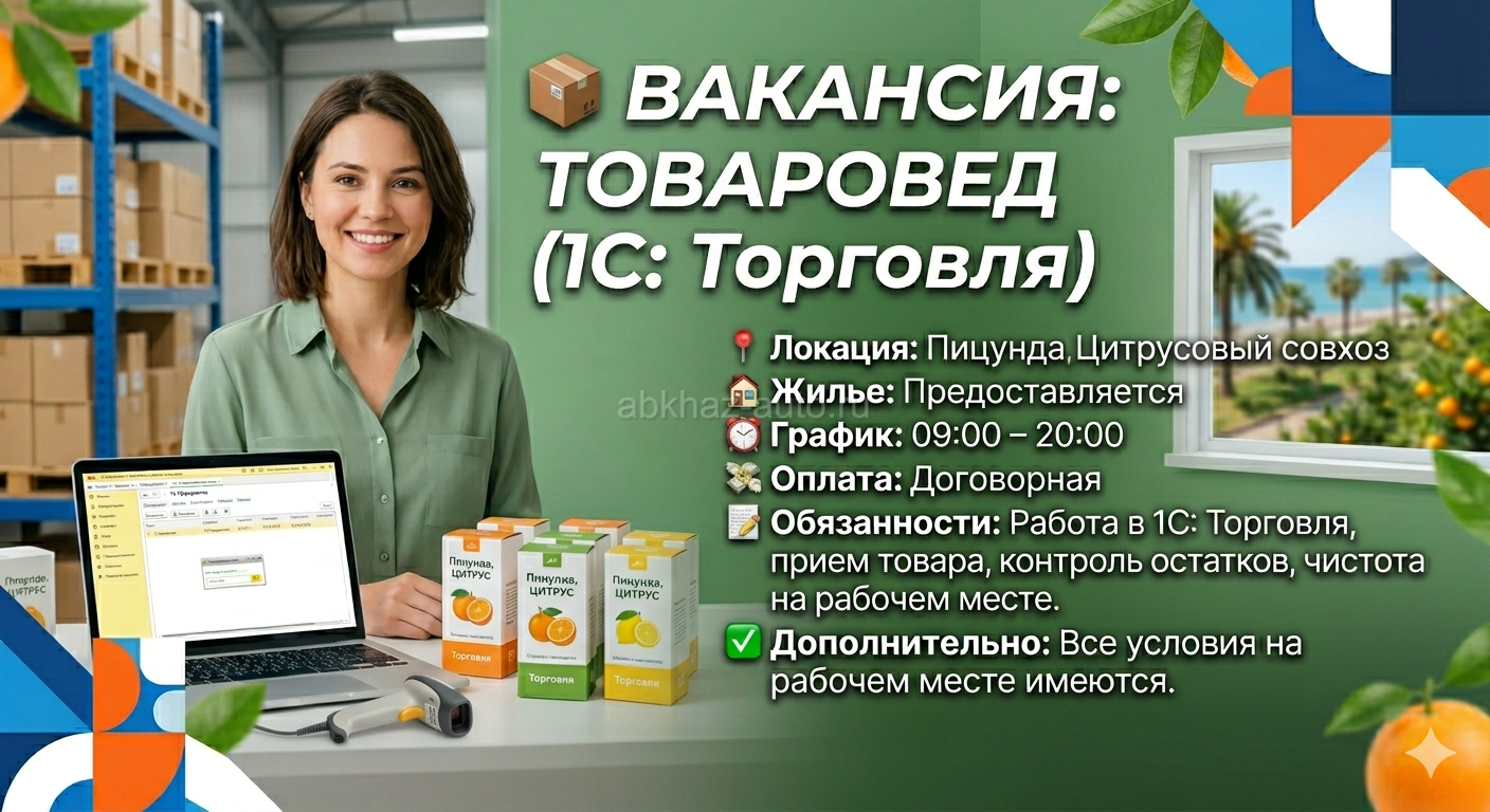 Дополнительная информация: 📦 Вакансия: Товаровед (1С: Торговля) Локация: Пицунда, Цитрусовый совхоз. Жилье: Предоставляется. • График: 09:00 – 20:00. • Оплата: Договорная. • Обязанности: Работа в 1С: Торговля, прием товара, контроль остатков, поддержание чистоты на рабочем месте. • Дополнительно: Все условия на рабочем месте имеются. Связь ТОЛЬКО через WhatsApp: 📞 +7 (940) 728-78-08