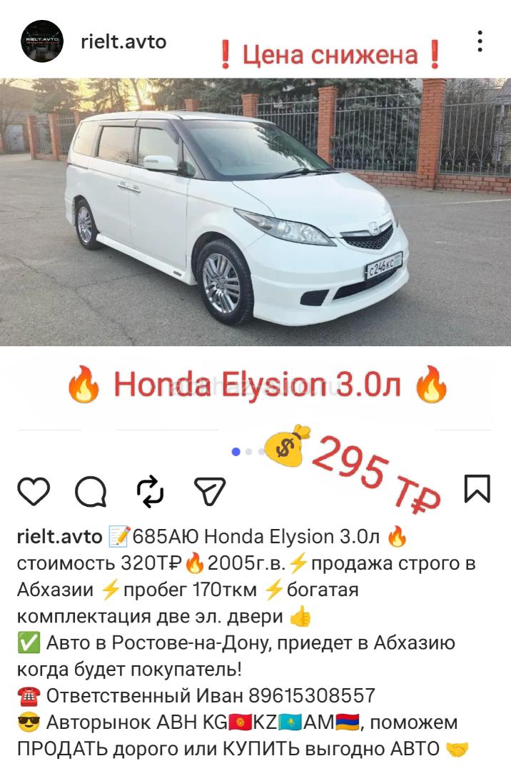Двигатель: бензиновый, 3.0 л Трансмиссия: автоматическая Кузов: минивэн Цвет: белый Пробег: 168 км Год выпуска: 2005 Регион: Вся Абхазия Дополнительная информация: 📝 Honda Elysion 3.0л 🔥 стоимость 295Т₽🔥2005г.в.⚡продажа строго в Абхазии ⚡пробег 170ткм ⚡богатая комплектация две эл. двери 👍 ✅ Авто в Ростове-на-Дону, приедет в Абхазию когда будет покупатель! ☎ Ответственный Иван 89615308557