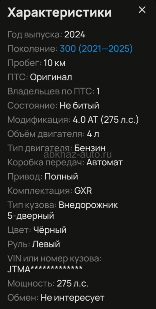 Двигатель: бензиновый, 4 л Трансмиссия: автоматическая Кузов: внедорожник Цвет: черный Пробег: 10 км Год выпуска: 2024 Регион: Гудаута Цена: 7 500 000 руб.
