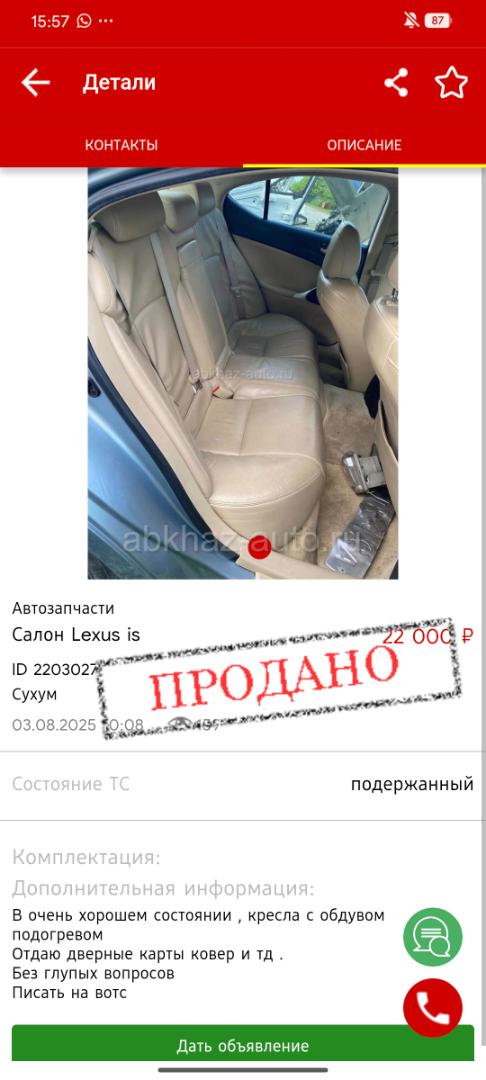 Дополнительная информация: Ищу живые сиденья на lexus is второе поколение Черная кожа, другие не предлагать Писать на Вотсапп звонок могу не увидеть