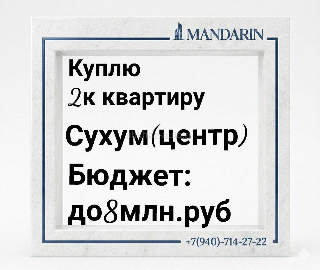 Дополнительная информация: Куплю 2ку в Центре Сухума. 1-2й этаж , желательно без ремонта. Бюджет: до 8 млн.руб