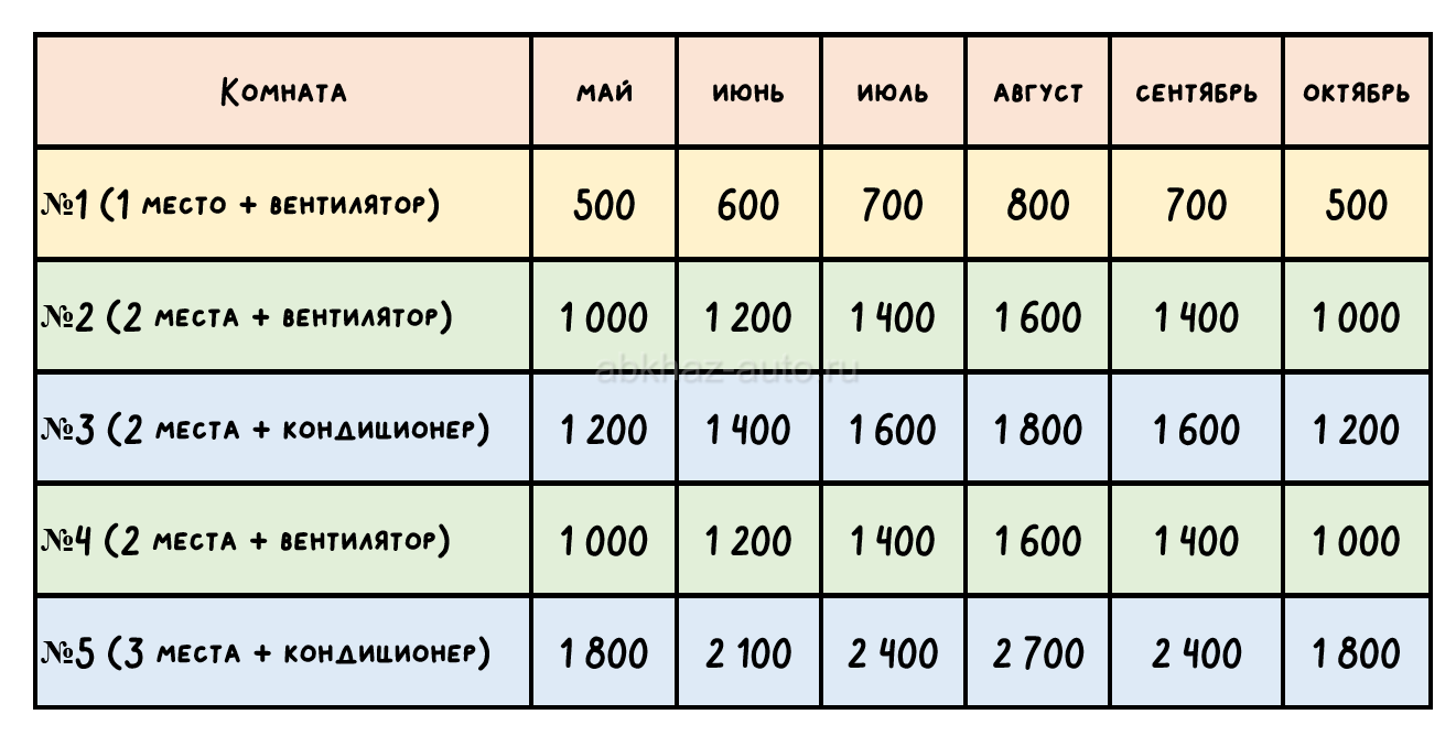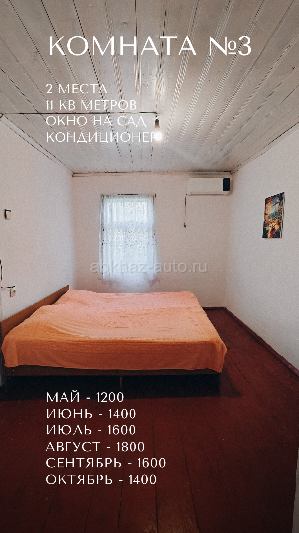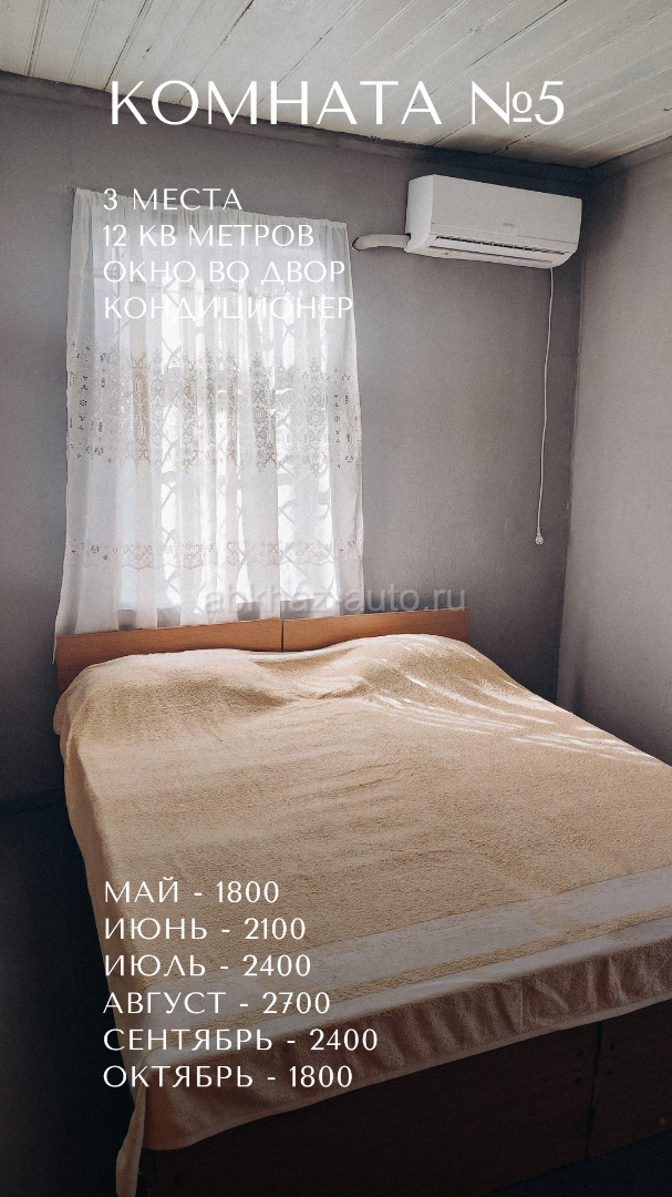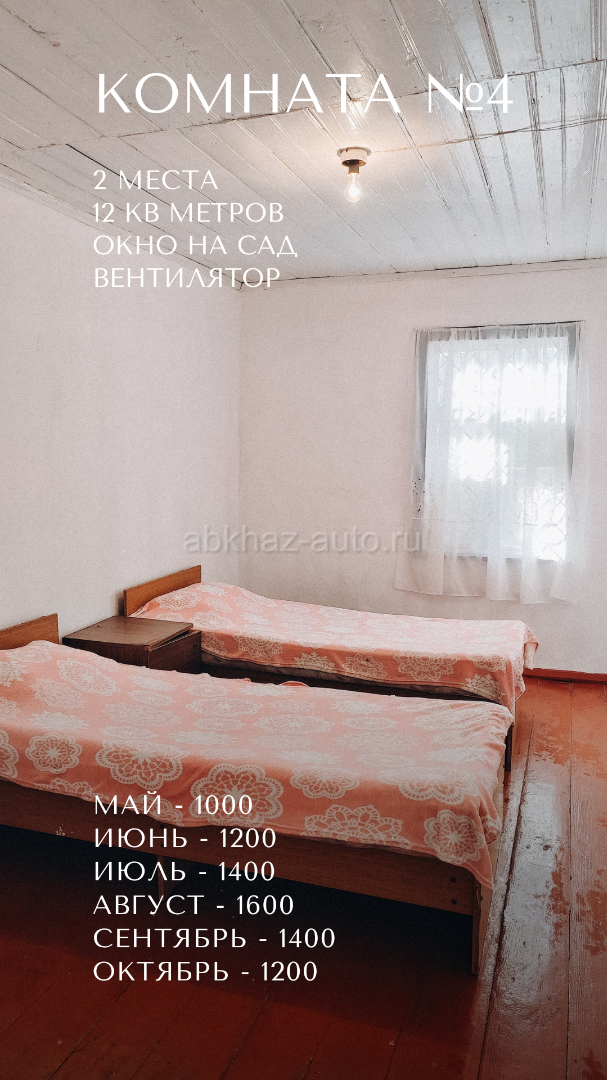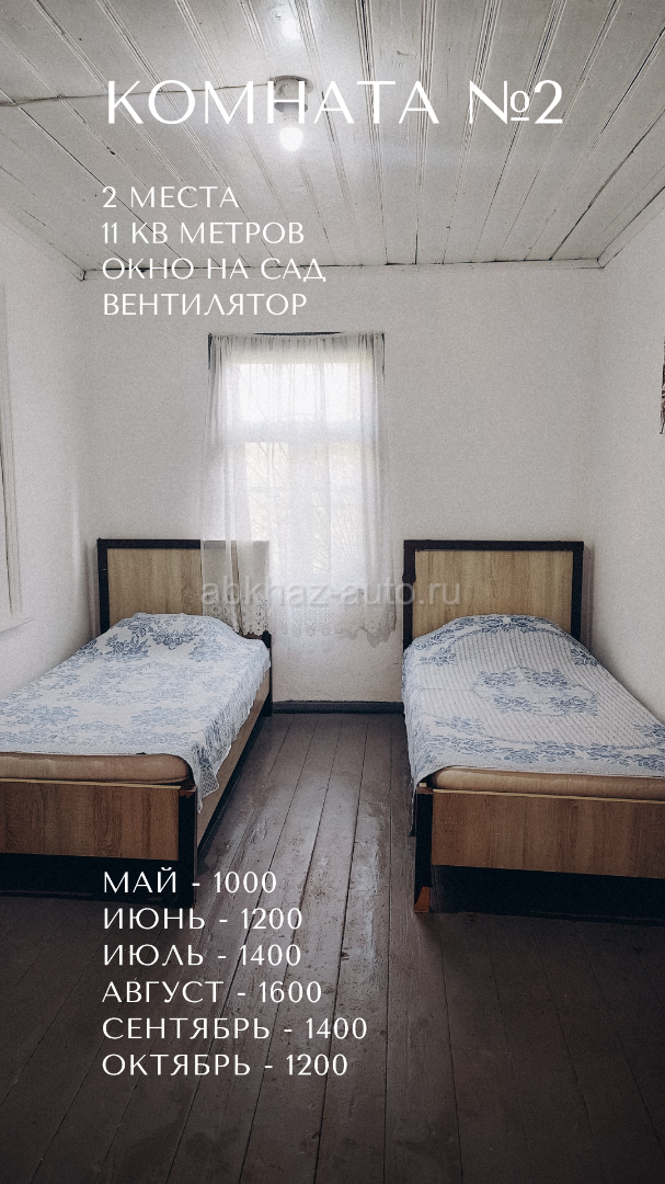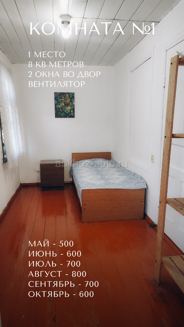 Дополнительная информация: Бюджетные и чистые комнаты в селе Лдзаа, ул. Адамия, 3 - на территории известного дома‑музея Хецуриани 🏡 Здесь по‑домашнему душевно и тепло, словно в деревне у бабушки ☺️ 🛏️ Цены от 500р до 900р за место (прайс на фото, номера идут по порядку) 👣 До моря - 15 минут, до магазина - 3, до рынка в Пицунде 25. 🔸 Большая территория с парковкой и фруктовым садом 🔸 Отдельное здание с бывшим кафе, где можно готовить 🔸 Общий туалет, душ, холодильник, утюг 🔸 Услуга стирки - 200 🔸 Wi‑Fi 🔹 В апреле сделан косметический ремонт 🔹 Изолированные комнаты находятся на 2 этаже с отдельным входом. Между комнатами есть двери, но они надёжно закрыты. 🔹 Курение в комнатах запрещено 🔸Предоплата - 20% (остальное - при заселении). 🔸Заезд с 14 часов, а выезд до 12. 💱 Условия возврата предоплаты: Отменили за 20 дней или раньше - вернём 100% предоплаты. Отменили меньше чем за 20 дней - предоплата не возвращается. Пишите сразу номер комнаты и даты на WA TG 8924-44-99-419 и я отвечу, свободна ли она. ❗ Бронирование возможно только после внесения предоплаты. И, пожалуйста, не звоните ночью - я тоже нуждаюсь в отдыхе 😴