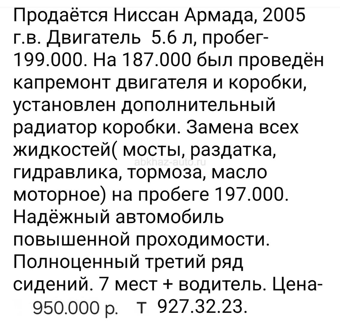 Двигатель: бензиновый, 5.6 л Трансмиссия: автоматическая Кузов: внедорожник Цвет: хаки Пробег: 199 км Год выпуска: 2005 Регион: Вся Абхазия Цена: 950 000 руб.