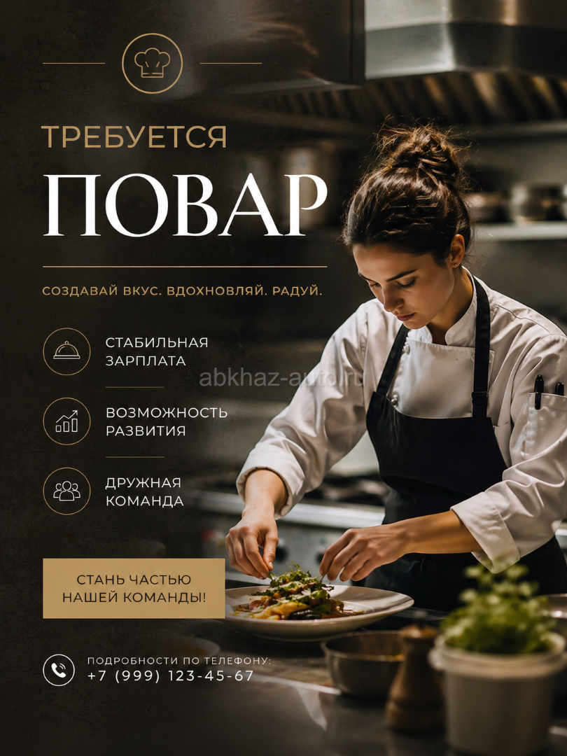 Дополнительная информация: В кафе в центре Сухума на постоянную стабильную работу требуется повар. Возраст - до 45 лет. Обучим позициям меню во время стажировки. Обращаться в вотсап по номерам: +7 940 957‑98‑09 / +7 940 776-01-10