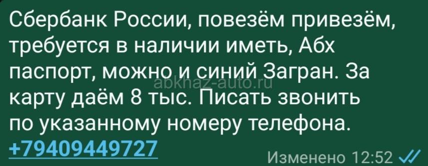 Сбербанк России, повезём привезём, требуется в наличии иметь, Абх паспорт, можно и синий Загран. За карту даём 8 тыс. Писать звонить по указанному номеру телефона. +79409449727