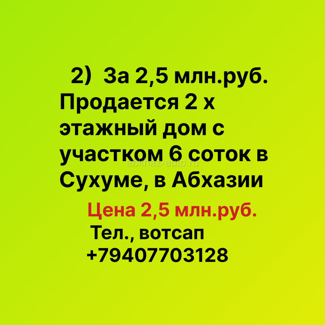 Дополнительная информация: 2) За 2,5 млн.руб. Продается 2 х этажный дом с участком 6 соток в Сухуме, заезд с ул. Чанба, в Абхазии, 2 км-2,5 км от моря, с видом на море. Довоенная собственность. НЕ трофей. На 2-м этаже расположены 2 спальни и зал, на 1-ом этаже находятся кухня, спальня и зал. Нужен ремонт. Дом находится на пригорке. Цена 2,5 млн.руб. Тел., вотсап +79407703128